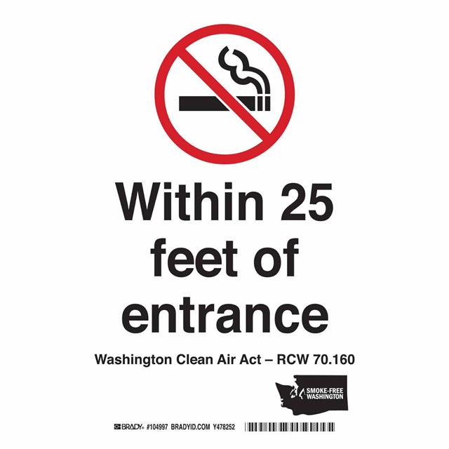This is manufactured by Brady Corporation. The manufacturer part number is 104997. Label with a size of 10.00" l x 7.00" w (254.0mm x 177.8mm). The product is rohs3 compliant. It is assigned with possible HTSUS value of 8310.00.0000. It is shipped in bulk package . It has a classic black and red legend, white background colour. The product brady®, is a highly preferred choice for users. The product is made from highly stable and reliable aluminum. In addition, it is reach unaffected. Its typical moisture sensitivity level is not applicable. A bespoke label is a within 25 feet of entrance - washington clean indoor air act - rcw 70.161 label. The product is suitable for use with warning. It has a long 4 weeks standard lead time. The product is designated with the ear99 code number.