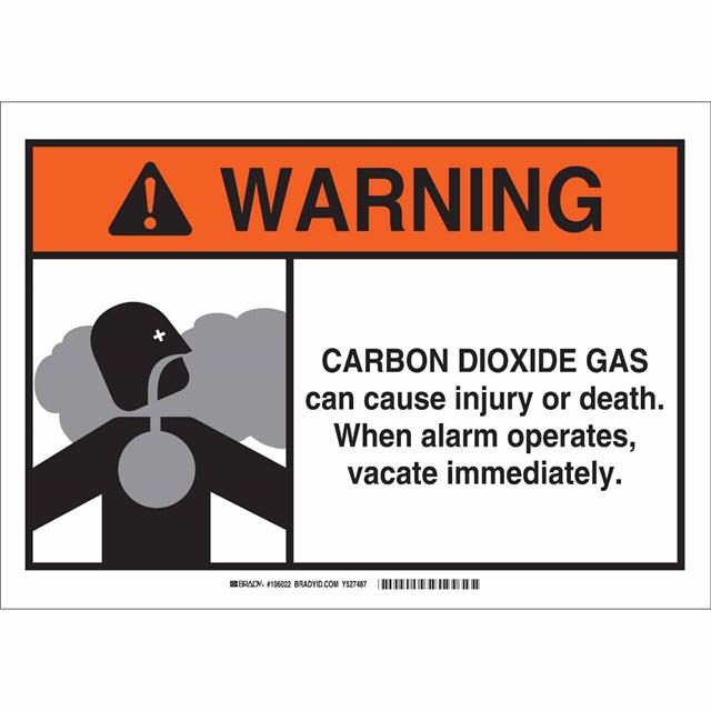 This is manufactured by Brady Corporation. The manufacturer part number is 106022. Label with a size of 14.00" l x 10.00" w (355.6mm x 254.0mm). The product is rohs3 compliant. It is assigned with possible HTSUS value of 3926.90.9985. It is shipped in bulk package . It has a classic black, gray and orange legend, white background colour. The product brady®, is a highly preferred choice for users. The product is made from highly stable and reliable fiberglass. In addition, it is reach unaffected. Its typical moisture sensitivity level is not applicable. A bespoke label is a warning. carbon dioxide gas can cause injury or death. when alarm operates, vacate immediately label. The product is suitable for use with warning. It has a long 4 weeks standard lead time. The product is designated with the ear99 code number.