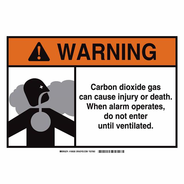 This is manufactured by Brady Corporation. The manufacturer part number is 106026. Label with a size of 14.00" l x 10.00" w (355.6mm x 254.0mm). The product is rohs3 compliant. It is assigned with possible HTSUS value of 3926.90.9985. It is shipped in bulk package . It has a classic black, gray and orange legend, white background colour. The product brady®, is a highly preferred choice for users. The product is made from highly stable and reliable polyester. In addition, it is reach unaffected. Its typical moisture sensitivity level is not applicable. A bespoke label is a warning. carbon dioxide gas can cause injury or death. when alarm operates, do not enter until ventilated label. The product is suitable for use with warning. It has a long 4 weeks standard lead time. The product is designated with the ear99 code number.
