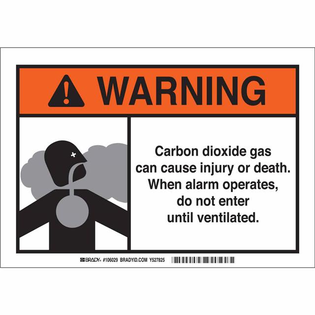This is manufactured by Brady Corporation. The manufacturer part number is 106029. Label with a size of 10.00" l x 7.00" w (254.0mm x 177.8mm). The product is rohs3 compliant. It is assigned with possible HTSUS value of 3926.90.9985. It is shipped in bulk package . It has a classic black, gray and orange legend, white background colour. The product brady®, is a highly preferred choice for users. The product is made from highly stable and reliable fiberglass. In addition, it is reach unaffected. Its typical moisture sensitivity level is not applicable. A bespoke label is a warning. carbon dioxide gas can cause injury or death. when alarm operates, do not enter until ventilated label. The product is suitable for use with warning. It has a long 4 weeks standard lead time. The product is designated with the ear99 code number.