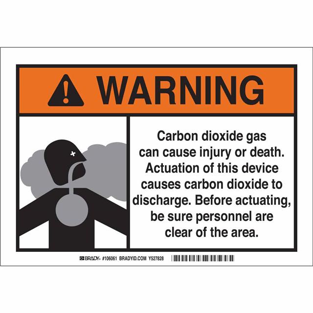 This is manufactured by Brady Corporation. The manufacturer part number is 106061. Label with a size of 10.00" l x 7.00" w (254.0mm x 177.8mm). The product is rohs3 compliant. It is assigned with possible HTSUS value of 3926.90.9985. It is shipped in bulk package . It has a classic black, gray and orange legend, white background colour. The product brady®, is a highly preferred choice for users. The product is made from highly stable and reliable fiberglass. In addition, it is reach unaffected. Its typical moisture sensitivity level is not applicable. A bespoke label is a warning. carbon dioxide gas can cause injury or death. actuation of this device causes carbon dioxide to discharge. before act… label. The product is suitable for use with warning. It has a long 4 weeks standard lead time. The product is designated with the ear99 code number.