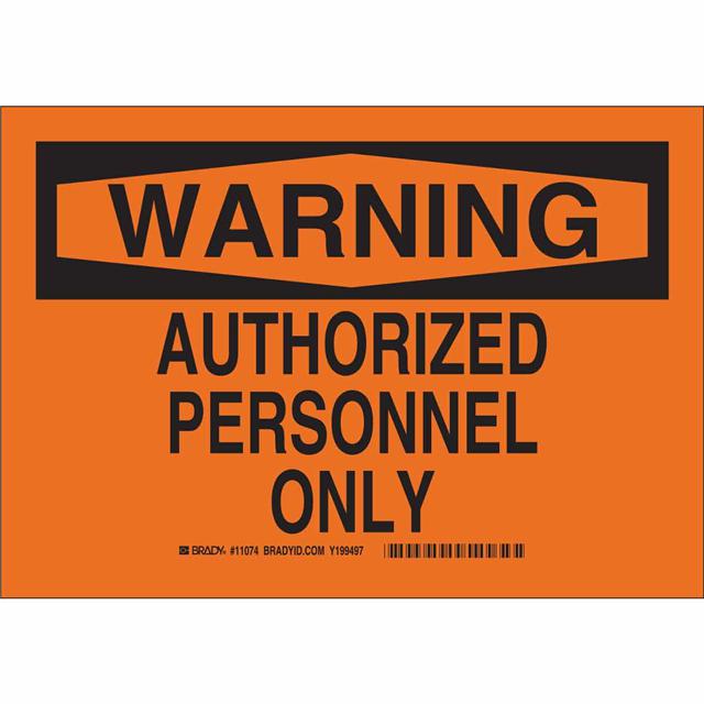 This is manufactured by Brady Corporation. The manufacturer part number is 11074. Label with a size of 10.00" l x 7.00" w (254.0mm x 177.8mm). It is assigned with possible HTSUS value of 3926.90.9985. It is shipped in bulk package . It has a classic black legend, orange background colour. The product brady®, is a highly preferred choice for users. The product is made from highly stable and reliable polyethylene. In addition, it is reach unaffected. Its typical moisture sensitivity level is not applicable. A bespoke label is a warning. authorized personnel only label. The product is suitable for use with warning. The product is designated with the ear99 code number.