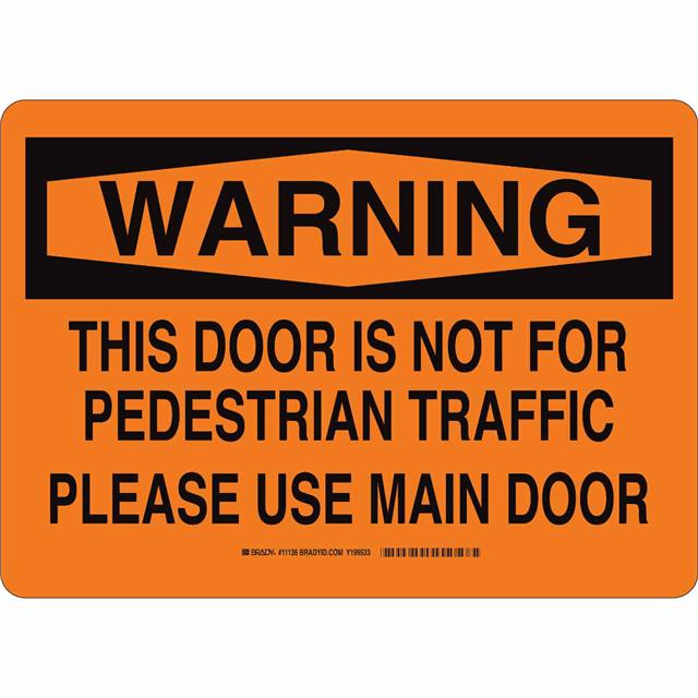 This is manufactured by Brady Corporation. The manufacturer part number is 11136. Label with a size of 14.00" l x 10.00" w (355.6mm x 254.0mm). The product is rohs3 compliant. It is assigned with possible HTSUS value of 3926.90.9989. It has a classic black legend, orange background colour. The product brady®, is a highly preferred choice for users. The product is made from highly stable and reliable polyethylene. In addition, it is reach unaffected. Its typical moisture sensitivity level is not applicable. In addition, bulk is the available packaging type of the product. A bespoke label is a warning. this door is not for pedestrian traffic please use main door label. The product is suitable for use with warning. The brady corporation's product offers user-desired applications. The product is designated with the ear99 code number.
