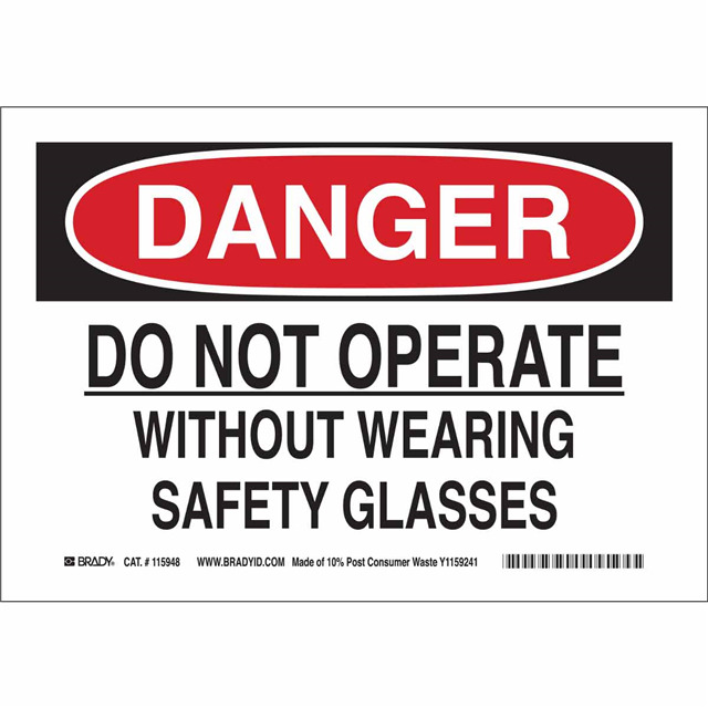 This is manufactured by Brady Corporation. The manufacturer part number is 116112. Label with a size of 10.00" l x 7.00" w (254.0mm x 177.8mm). The product is not applicable. It is assigned with possible HTSUS value of 3926.90.9989. It has a classic black and red legend, white background colour. The product brady®, is a highly preferred choice for users. The product is made from highly stable and reliable polypropylene. In addition, it is reach unaffected. Its typical moisture sensitivity level is not applicable. In addition, bulk is the available packaging type of the product. A bespoke label is a danger. do not operate without wearing safety glasses label. The product is suitable for use with warning. It has a long 4 weeks standard lead time. The brady corporation's product offers user-desired applications. The product is designated with the ear99 code number.