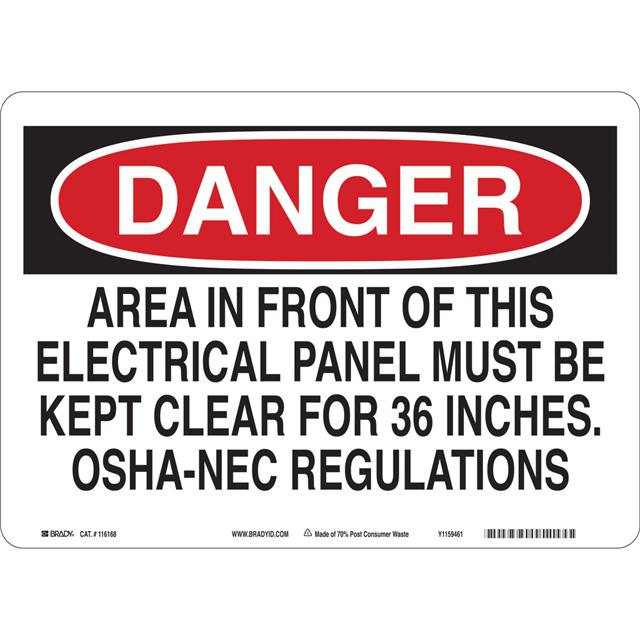 This is manufactured by Brady Corporation. The manufacturer part number is 116168. Label with a size of 14.00" l x 10.00" w (355.6mm x 254.0mm). The product is not applicable. It is assigned with possible HTSUS value of 3926.90.9989. It has a classic black and red legend, white background colour. The product brady®, is a highly preferred choice for users. The product is made from highly stable and reliable polypropylene. In addition, it is reach unaffected. Its typical moisture sensitivity level is not applicable. In addition, bulk is the available packaging type of the product. A bespoke label is a area in front of this electrical panel must be kept clear for 36 inches label. The product is suitable for use with warning. It has a long 4 weeks standard lead time. The brady corporation's product offers user-desired applications. The product is designated with the ear99 code number.