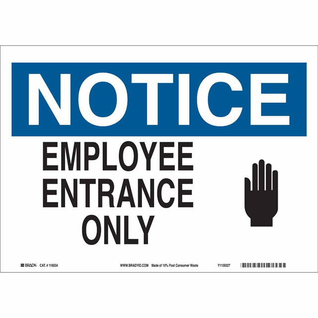 This is manufactured by Brady Corporation. The manufacturer part number is 116198. Label with a size of 14.00" l x 10.00" w (355.6mm x 254.0mm). The product is not applicable. It is assigned with possible HTSUS value of 3926.90.9989. It has a classic black and blue legend, white background colour. The product brady®, is a highly preferred choice for users. The product is made from highly stable and reliable polypropylene. In addition, it is reach unaffected. Its typical moisture sensitivity level is not applicable. In addition, bulk is the available packaging type of the product. A bespoke label is a notice employee entrance only label. The product is suitable for use with notice. It has a long 4 weeks standard lead time. The brady corporation's product offers user-desired applications. The product is designated with the ear99 code number.