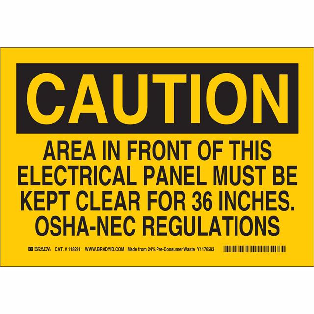 This is manufactured by Brady Corporation. The manufacturer part number is 116235. Label with a size of 10.00" l x 7.00" w (254.0mm x 177.8mm). The product is not applicable. It is assigned with possible HTSUS value of 3926.90.9985. It is shipped in bulk package . It has a classic black legend, yellow background colour. The product brady®, is a highly preferred choice for users. The product is made from highly stable and reliable polypropylene. In addition, it is reach unaffected. Its typical moisture sensitivity level is not applicable. A bespoke label is a caution. area in front of this electrical panel must be kept clear for 36 inches label. It has a long 4 weeks standard lead time. The product is designated with the ear99 code number.