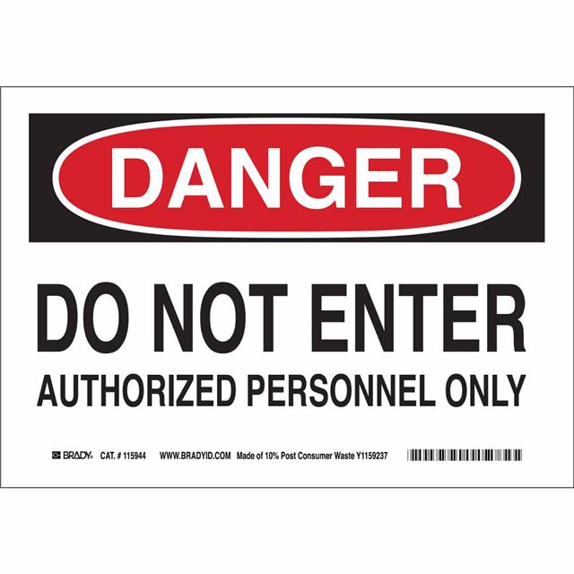 This is manufactured by Brady Corporation. The manufacturer part number is 118165. Label with a size of 14.00" l x 10.00" w (355.6mm x 254.0mm). The product is not applicable. It is assigned with possible HTSUS value of 3926.90.9985. It is shipped in bulk package . It has a classic black and red legend, white background colour. The product brady®, is a highly preferred choice for users. The product is made from highly stable and reliable plastic. In addition, it is reach unaffected. Its typical moisture sensitivity level is not applicable. A bespoke label is a danger. do not enter authorized personnel only label. It has a long 4 weeks standard lead time. The product is designated with the ear99 code number.