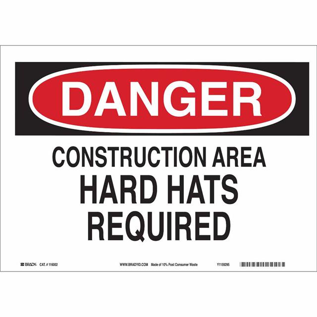 This is manufactured by Brady Corporation. The manufacturer part number is 118222. Label with a size of 14.00" l x 10.00" w (355.6mm x 254.0mm). The product is not applicable. It is assigned with possible HTSUS value of 3926.90.9985. It is shipped in bulk package . It has a classic black and red legend, white background colour. The product brady®, is a highly preferred choice for users. The product is made from highly stable and reliable plastic. In addition, it is reach unaffected. Its typical moisture sensitivity level is not applicable. A bespoke label is a danger. construction area hard hats required label. The product is designated with the ear99 code number.