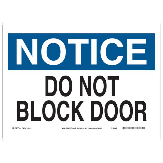 This is manufactured by Brady Corporation. The manufacturer part number is 118241. Label with a size of 14.00" l x 10.00" w (355.6mm x 254.0mm). The product is not applicable. It is assigned with possible HTSUS value of 3926.90.9985. It is shipped in bulk package . It has a classic black and blue legend, white background colour. The product brady®, is a highly preferred choice for users. The product is made from highly stable and reliable plastic. In addition, it is reach unaffected. Its typical moisture sensitivity level is not applicable. A bespoke label is a notice. do not block door label. It has a long 4 weeks standard lead time. The product is designated with the ear99 code number.