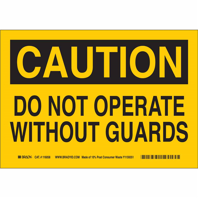 This is manufactured by Brady Corporation. The manufacturer part number is 118279. Label with a size of 14.00" l x 10.00" w (355.6mm x 254.0mm). The product is not applicable. It is assigned with possible HTSUS value of 3926.90.9989. It has a classic black legend, yellow background colour. The product brady®, is a highly preferred choice for users. The product is made from highly stable and reliable plastic. In addition, it is reach unaffected. Its typical moisture sensitivity level is not applicable. In addition, bulk is the available packaging type of the product. A bespoke label is a caution. do not operate without guards label. The brady corporation's product offers user-desired applications. The product is designated with the ear99 code number.