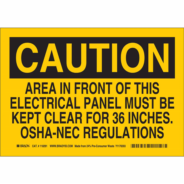 This is manufactured by Brady Corporation. The manufacturer part number is 118290. Label with a size of 14.00" l x 10.00" w (355.6mm x 254.0mm). The product is not applicable. It is assigned with possible HTSUS value of 3926.90.9989. It has a classic black legend, yellow background colour. The product brady®, is a highly preferred choice for users. The product is made from highly stable and reliable plastic. In addition, it is reach unaffected. Its typical moisture sensitivity level is not applicable. In addition, bulk is the available packaging type of the product. A bespoke label is a caution. area in front of this electrical panel must be kept clear for 36 inches label. The brady corporation's product offers user-desired applications. The product is designated with the ear99 code number.