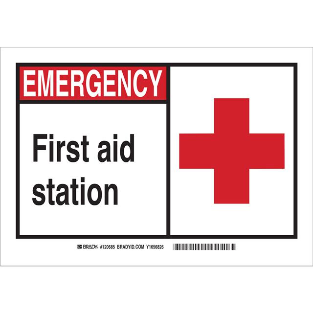 This is manufactured by Brady Corporation. The manufacturer part number is 120685. Label with a size of 10.00" l x 7.00" w (254.0mm x 177.8mm). The product is rohs3 compliant. It is assigned with possible HTSUS value of 3926.90.9985. It is shipped in bulk package . It has a classic black and red legend, white background colour. The product brady®, is a highly preferred choice for users. The product is made from highly stable and reliable polyester. In addition, it is reach unaffected. Its typical moisture sensitivity level is not applicable. A bespoke label is a emergency. first aid station label. It has a long 4 weeks standard lead time. The product is designated with the ear99 code number.