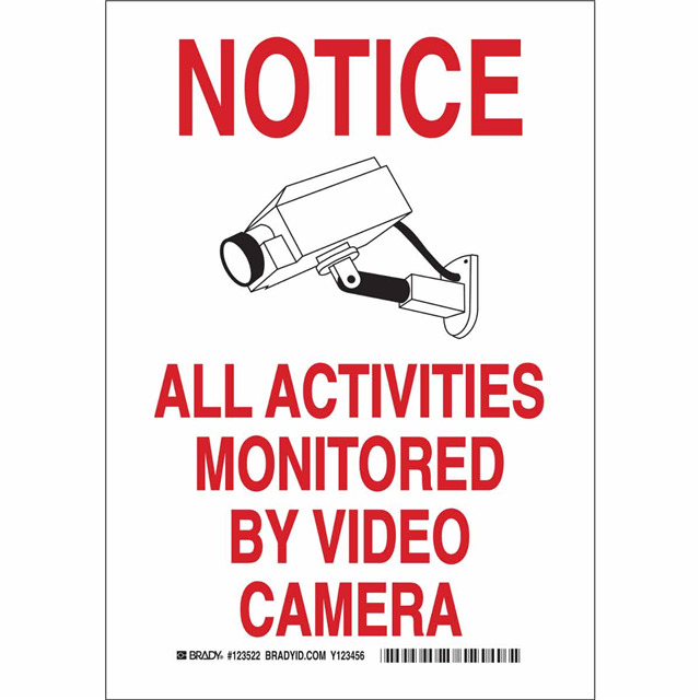 This is manufactured by Brady Corporation. The manufacturer part number is 123521. Label with a size of 10.00" l x 7.00" w (254.0mm x 177.8mm). The product is rohs3 compliant. It is assigned with possible HTSUS value of 3926.90.9989. It has a classic black and red legend, white background colour. The product brady®, is a highly preferred choice for users. The product is made from highly stable and reliable polyester. In addition, it is reach unaffected. Its typical moisture sensitivity level is not applicable. In addition, bulk is the available packaging type of the product. A bespoke label is a notice. all activities monitored by video camera label. The product is suitable for use with notice. It has a long 4 weeks standard lead time. The brady corporation's product offers user-desired applications. The product is designated with the ear99 code number.