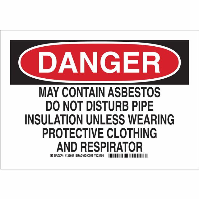 This is manufactured by Brady Corporation. The manufacturer part number is 123665. Label with a size of 10.00" l x 7.00" w (254.0mm x 177.8mm). The product is rohs3 compliant. It is assigned with possible HTSUS value of 8310.00.0000. It has a classic black and red legend, white background colour. The product brady®, is a highly preferred choice for users. The product is made from highly stable and reliable aluminum. In addition, it is reach unaffected. Its typical moisture sensitivity level is not applicable. In addition, bulk is the available packaging type of the product. A bespoke label is a danger. may contain asbestos do not disturb pipe insulation unless wearing protective clothing and respirator label. The product is suitable for use with warning. It has a long 4 weeks standard lead time. The brady corporation's product offers user-desired applications. The product is designated with the ear99 code number.