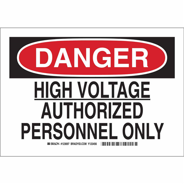 This is manufactured by Brady Corporation. The manufacturer part number is 123696. Label with a size of 10.00" l x 7.00" w (254.0mm x 177.8mm). The product is rohs3 compliant. It is assigned with possible HTSUS value of 3926.90.9989. It has a classic black and red legend, white background colour. The product brady®, is a highly preferred choice for users. The product is made from highly stable and reliable polyester. In addition, it is reach unaffected. Its typical moisture sensitivity level is not applicable. In addition, bulk is the available packaging type of the product. A bespoke label is a danger. high voltage authorized personnel only label. The product is suitable for use with danger. It has a long 4 weeks standard lead time. The brady corporation's product offers user-desired applications. The product is designated with the ear99 code number.