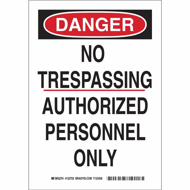 This is manufactured by Brady Corporation. The manufacturer part number is 123706. Label with a size of 14.00" l x 10.00" w (355.6mm x 254.0mm). The product is rohs3 compliant. It is assigned with possible HTSUS value of 3926.90.9989. It has a classic black and red legend, white background colour. The product brady®, is a highly preferred choice for users. The product is made from highly stable and reliable polyester. In addition, it is reach unaffected. Its typical moisture sensitivity level is not applicable. In addition, bulk is the available packaging type of the product. A bespoke label is a danger. no trespassing authorized personnel only label. The product is suitable for use with danger. It has a long 4 weeks standard lead time. The brady corporation's product offers user-desired applications. The product is designated with the ear99 code number.