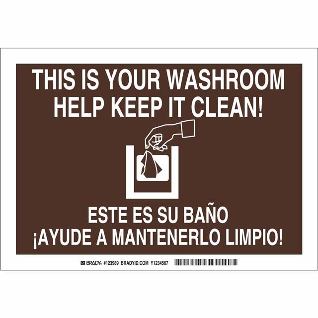 This is manufactured by Brady Corporation. The manufacturer part number is 123991. Label with a size of 10.00" l x 7.00" w (254.0mm x 177.8mm). The product is rohs3 compliant. It is assigned with possible HTSUS value of 3926.90.9985. It is shipped in bulk package . It has a classic white legend, brown background colour. The product brady®, is a highly preferred choice for users. The product is made from highly stable and reliable polyester. In addition, it is reach unaffected. Its typical moisture sensitivity level is not applicable. A bespoke label is a this is your washroom help keep it clean!/este essu bano ayude a mantenerlo limpio! label. The product is suitable for use with warning. It has a long 4 weeks standard lead time. The product is designated with the ear99 code number.