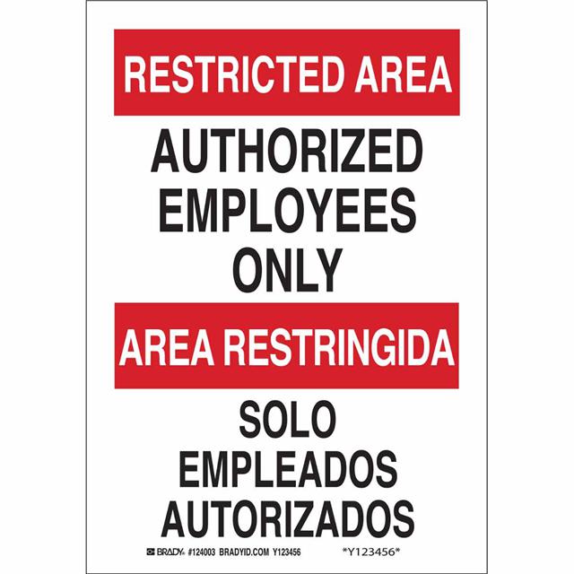 This is manufactured by Brady Corporation. The manufacturer part number is 124005. Label with a size of 14.00" l x 10.00" w (355.6mm x 254.0mm). The product is rohs3 compliant. It is assigned with possible HTSUS value of 3926.90.9989. It has a classic black and red legend, white background colour. The product brady®, is a highly preferred choice for users. The product is made from highly stable and reliable polyester. In addition, it is reach unaffected. Its typical moisture sensitivity level is not applicable. In addition, bulk is the available packaging type of the product. A bespoke label is a restricted area/area restringida. authorized employees only/solo empleados autorizados label. The product is suitable for use with warning. It has a long 4 weeks standard lead time. The brady corporation's product offers user-desired applications. The product is designated with the ear99 code number.