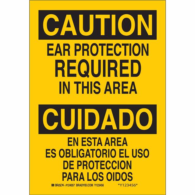 This is manufactured by Brady Corporation. The manufacturer part number is 124056. Label with a size of 10.00" l x 7.00" w (254.0mm x 177.8mm). The product is rohs3 compliant. It is assigned with possible HTSUS value of 3926.90.9985. It is shipped in bulk package . It has a classic black legend, yellow background colour. The product brady®, is a highly preferred choice for users. The product is made from highly stable and reliable polyester. In addition, it is reach unaffected. Its typical moisture sensitivity level is not applicable. A bespoke label is a caution/cuidado. ear protection required in this area/en esta area es obligatorio el uso de proteccion para los oidos label. It has a long 4 weeks standard lead time. The product is designated with the ear99 code number.