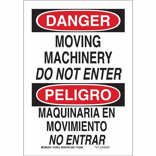 This is manufactured by Brady Corporation. The manufacturer part number is 124074. Label with a size of 10.00" l x 7.00" w (254.0mm x 177.8mm). The product is rohs3 compliant. It is assigned with possible HTSUS value of 3926.90.9985. It is shipped in bulk package . It has a classic black and red legend, white background colour. The product brady®, is a highly preferred choice for users. The product is made from highly stable and reliable polyester. In addition, it is reach unaffected. Its typical moisture sensitivity level is not applicable. A bespoke label is a danger/peligro. moving machinery do not enter/maquinaria en movimiento label. The product is suitable for use with warning. It has a long 4 weeks standard lead time. The product is designated with the ear99 code number.