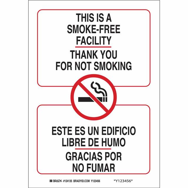 This is manufactured by Brady Corporation. The manufacturer part number is 124135. Label with a size of 10.00" l x 7.00" w (254.0mm x 177.8mm). The product is rohs3 compliant. It is assigned with possible HTSUS value of 3926.90.9985. It is shipped in bulk package . It has a classic black and red legend, white background colour. The product brady®, is a highly preferred choice for users. The product is made from highly stable and reliable polyester. In addition, it is reach unaffected. Its typical moisture sensitivity level is not applicable. A bespoke label is a this is a smoke- free facility thank you for not smoking/este es un edificio libre de humo gracias por no fumar label. It has a long 4 weeks standard lead time. The product is designated with the ear99 code number.