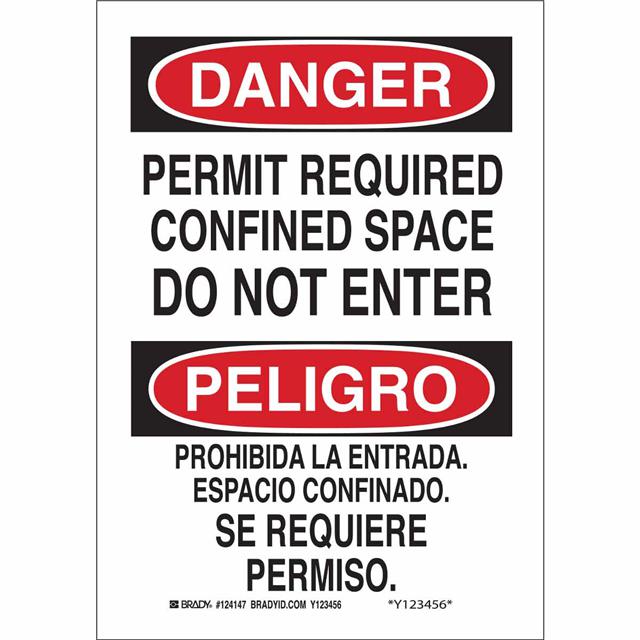 This is manufactured by Brady Corporation. The manufacturer part number is 124149. Label with a size of 14.00" l x 10.00" w (355.6mm x 254.0mm). The product is rohs3 compliant. It is assigned with possible HTSUS value of 3926.90.9985. It is shipped in bulk package . It has a classic black and red legend, white background colour. The product brady®, is a highly preferred choice for users. The product is made from highly stable and reliable polyester. In addition, it is reach unaffected. Its typical moisture sensitivity level is not applicable. A bespoke label is a permit required confined space do not enter. prohibida la entrada. espacio confinado. se label. The product is suitable for use with warning. It has a long 4 weeks standard lead time. The product is designated with the ear99 code number.