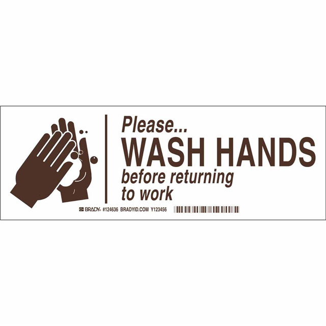 This is manufactured by Brady Corporation. The manufacturer part number is 124634. Label with a size of 10.00" l x 3.50" w (254.0mm x 88.9mm). The product is rohs3 compliant. It is assigned with possible HTSUS value of 8310.00.0000. It has a classic brown legend, white background colour. The product brady®, is a highly preferred choice for users. The product is made from highly stable and reliable aluminum. In addition, it is reach unaffected. Its typical moisture sensitivity level is not applicable. In addition, bulk is the available packaging type of the product. A bespoke label is a please...wash hands before returning to work label. It has a long 4 weeks standard lead time. The brady corporation's product offers user-desired applications. The product is designated with the ear99 code number.