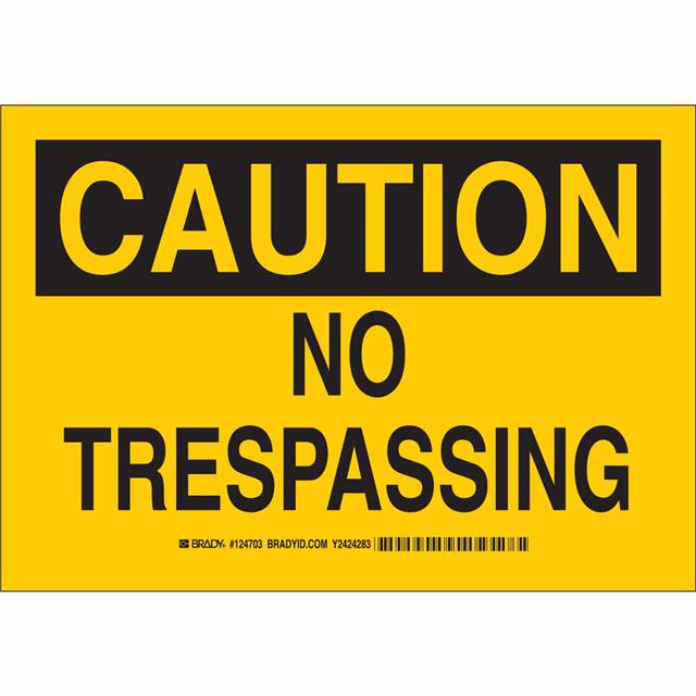This is manufactured by Brady Corporation. The manufacturer part number is 124703. Label with a size of 10.00" l x 7.00" w (254.0mm x 177.8mm). The product is rohs3 compliant. It is assigned with possible HTSUS value of 3926.90.9985. It is shipped in bulk package . It has a classic black legend, yellow background colour. The product brady®, is a highly preferred choice for users. The product is made from highly stable and reliable polyester. In addition, it is reach unaffected. Its typical moisture sensitivity level is not applicable. A bespoke label is a caution. no trespassing label. The product is suitable for use with warning. It has a long 4 weeks standard lead time. The product is designated with the ear99 code number.