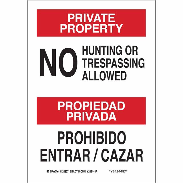 This is manufactured by Brady Corporation. The manufacturer part number is 124910. Label with a size of 14.00" l x 10.00" w (355.6mm x 254.0mm). The product is rohs3 compliant. It is assigned with possible HTSUS value of 3926.90.9985. It is shipped in bulk package . It has a classic black and red legend, white background colour. The product brady®, is a highly preferred choice for users. The product is made from highly stable and reliable polyester. In addition, it is reach unaffected. Its typical moisture sensitivity level is not applicable. A bespoke label is a private property/propiedad privada. no hunting or trespassing allowed/prohibido entrar/cazar label. The product is suitable for use with warning. It has a long 4 weeks standard lead time. The product is designated with the ear99 code number.