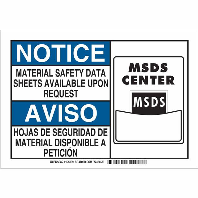 This is manufactured by Brady Corporation. The manufacturer part number is 125007. Label with a size of 10.00" l x 7.00" w (254.0mm x 177.8mm). The product is rohs3 compliant. It is assigned with possible HTSUS value of 8310.00.0000. It has a classic black and blue legend, white background colour. The product brady®, is a highly preferred choice for users. The product is made from highly stable and reliable aluminum. In addition, it is reach unaffected. Its typical moisture sensitivity level is not applicable. In addition, bulk is the available packaging type of the product. A bespoke label is a notice/aviso. material safety data sheets available upon request/hojas de seguridad de material disponible a peticion label. The brady corporation's product offers user-desired applications. The product is designated with the ear99 code number.