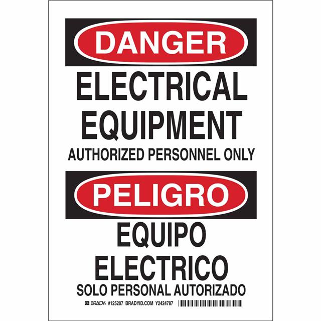 This is manufactured by Brady Corporation. The manufacturer part number is 125205. Label with a size of 10.00" l x 7.00" w (254.0mm x 177.8mm). The product is rohs3 compliant. It is assigned with possible HTSUS value of 8310.00.0000. It has a classic black and red legend, white background colour. The product brady®, is a highly preferred choice for users. The product is made from highly stable and reliable aluminum. In addition, it is reach unaffected. Its typical moisture sensitivity level is not applicable. In addition, bulk is the available packaging type of the product. A bespoke label is a danger/peligro. electrical equipment authorized personnel only/equipo electrico solo personal autorizado label. The product is suitable for use with warning. It has a long 4 weeks standard lead time. The brady corporation's product offers user-desired applications. The product is designated with the ear99 code number.