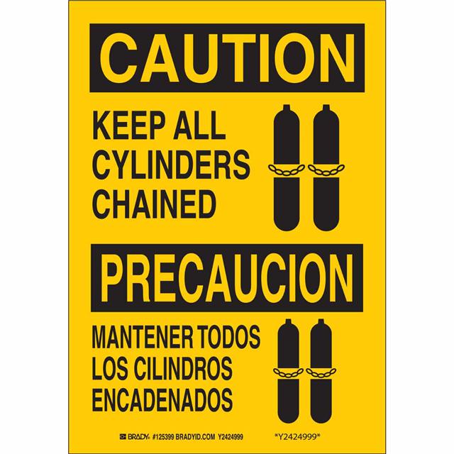 This is manufactured by Brady Corporation. The manufacturer part number is 125398. Label with a size of 10.00" l x 7.00" w (254.0mm x 177.8mm). The product is rohs3 compliant. It is assigned with possible HTSUS value of 3926.90.9985. It is shipped in bulk package . It has a classic black legend, yellow background colour. The product brady®, is a highly preferred choice for users. The product is made from highly stable and reliable polyester. In addition, it is reach unaffected. Its typical moisture sensitivity level is not applicable. A bespoke label is a caution/precaucion. keep all cylinders chained/mantener todos los cilindros encadenados label. The product is designated with the ear99 code number.