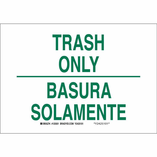 This is manufactured by Brady Corporation. The manufacturer part number is 125504. Label with a size of 14.00" l x 10.00" w (355.6mm x 254.0mm). The product is rohs3 compliant. It is assigned with possible HTSUS value of 3926.90.9989. It has a classic green legend, white background colour. The product brady®, is a highly preferred choice for users. The product is made from highly stable and reliable polyester. In addition, it is reach unaffected. Its typical moisture sensitivity level is not applicable. In addition, bulk is the available packaging type of the product. A bespoke label is a trash only/basura solamente label. The product is suitable for use with warning. It has a long 4 weeks standard lead time. The brady corporation's product offers user-desired applications. The product is designated with the ear99 code number.