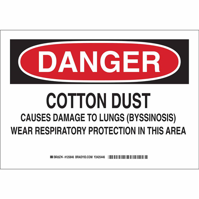 This is manufactured by Brady Corporation. The manufacturer part number is 125848. Label with a size of 14.00" l x 10.00" w (355.6mm x 254.0mm). The product is rohs3 compliant. It is assigned with possible HTSUS value of 3926.90.9989. It has a classic black and red legend, white background colour. The product brady®, is a highly preferred choice for users. The product is made from highly stable and reliable polyester. In addition, it is reach unaffected. Its typical moisture sensitivity level is not applicable. In addition, bulk is the available packaging type of the product. A bespoke label is a danger. cotton dust causes damage to lungs (byssinosis)wear respiratory protection in this area label. The product is suitable for use with danger. The brady corporation's product offers user-desired applications. The product is designated with the ear99 code number.