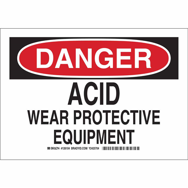 This is manufactured by Brady Corporation. The manufacturer part number is 126106. Label with a size of 14.00" l x 10.00" w (355.6mm x 254.0mm). The product is rohs3 compliant. It is assigned with possible HTSUS value of 3926.90.9989. It has a classic black and red legend, white background colour. The product brady®, is a highly preferred choice for users. The product is made from highly stable and reliable polyester. In addition, it is reach unaffected. Its typical moisture sensitivity level is not applicable. In addition, bulk is the available packaging type of the product. A bespoke label is a danger. acid wear protective equipment label. It has a long 4 weeks standard lead time. The brady corporation's product offers user-desired applications. The product is designated with the ear99 code number.