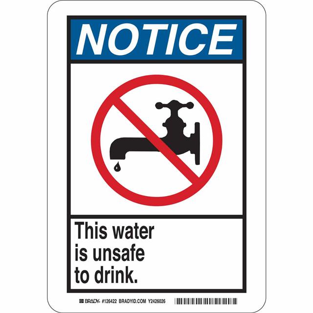 This is manufactured by Brady Corporation. The manufacturer part number is 126422. Label with a size of 10.00" l x 7.00" w (254.0mm x 177.8mm). The product is rohs3 compliant. It is assigned with possible HTSUS value of 3926.90.9985. It is shipped in bulk package . It has a classic black, blue and red legend, white background colour. The product brady®, is a highly preferred choice for users. The product is made from highly stable and reliable polyester. In addition, it is reach unaffected. Its typical moisture sensitivity level is not applicable. A bespoke label is a notice. this water is unsafe to drink label. The product is suitable for use with notice. It has a long 4 weeks standard lead time. The product is designated with the ear99 code number.
