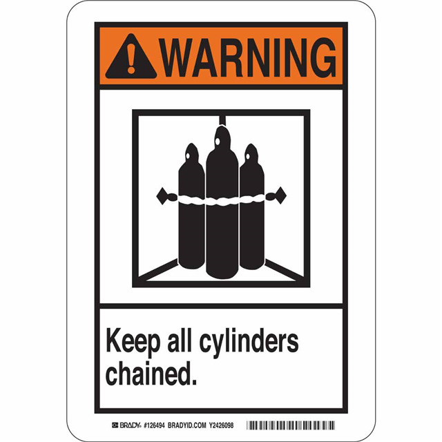 This is manufactured by Brady Corporation. The manufacturer part number is 126492. Label with a size of 10.00" l x 7.00" w (254.0mm x 177.8mm). The product is rohs3 compliant. It is assigned with possible HTSUS value of 8310.00.0000. It has a classic black and orange legend, white background colour. The product brady®, is a highly preferred choice for users. The product is made from highly stable and reliable aluminum. In addition, it is reach unaffected. Its typical moisture sensitivity level is not applicable. In addition, bulk is the available packaging type of the product. A bespoke label is a warning. keep all cylinders chained label. The product is suitable for use with warning. It has a long 4 weeks standard lead time. The brady corporation's product offers user-desired applications. The product is designated with the ear99 code number.