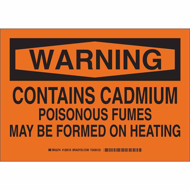 This is manufactured by Brady Corporation. The manufacturer part number is 126516. Label with a size of 10.00" l x 7.00" w (254.0mm x 177.8mm). The product is rohs3 compliant. It is assigned with possible HTSUS value of 8310.00.0000. It is shipped in bulk package . It has a classic black legend, orange background colour. The product brady®, is a highly preferred choice for users. The product is made from highly stable and reliable aluminum. In addition, it is reach unaffected. Its typical moisture sensitivity level is not applicable. A bespoke label is a warning. contains cadmium poisonous fumes may be formed on heating label. The product is suitable for use with warning. It has a long 4 weeks standard lead time. The product is designated with the ear99 code number.