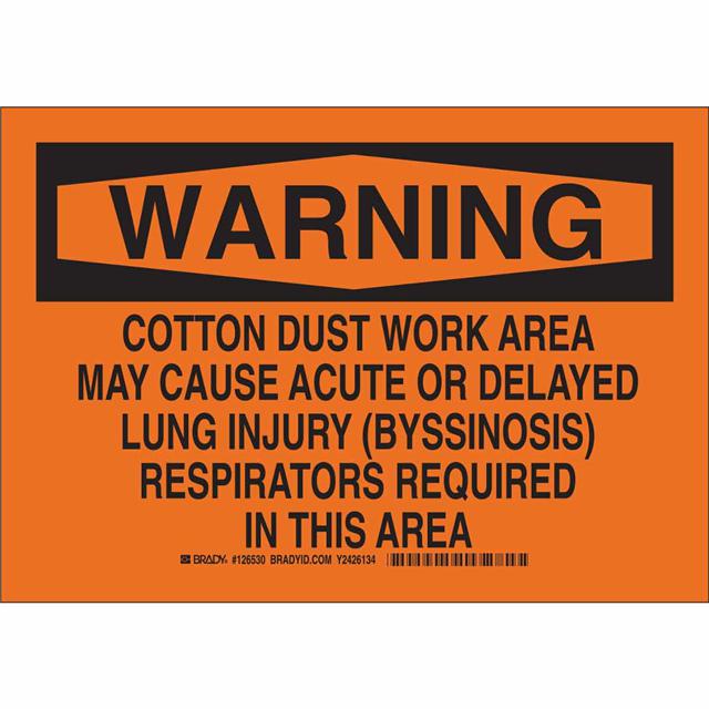 This is manufactured by Brady Corporation. The manufacturer part number is 126532. Label with a size of 14.00" l x 10.00" w (355.6mm x 254.0mm). The product is rohs3 compliant. It is assigned with possible HTSUS value of 3926.90.9985. It is shipped in bulk package . It has a classic black legend, orange background colour. The product brady®, is a highly preferred choice for users. The product is made from highly stable and reliable polyester. In addition, it is reach unaffected. Its typical moisture sensitivity level is not applicable. A bespoke label is a warning. cotton dust work area may cause acute or delayed lung injury (byssinosis) respirators required in this area label. The product is suitable for use with warning. It has a long 4 weeks standard lead time. The product is designated with the ear99 code number.