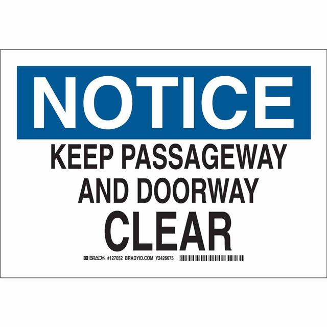This is manufactured by Brady Corporation. The manufacturer part number is 127052. Label with a size of 10.00" l x 7.00" w (254.0mm x 177.8mm). The product is rohs3 compliant. It is assigned with possible HTSUS value of 3926.90.9985. It is shipped in bulk package . It has a classic black and blue legend, white background colour. The product brady®, is a highly preferred choice for users. The product is made from highly stable and reliable polyester. In addition, it is reach unaffected. Its typical moisture sensitivity level is not applicable. A bespoke label is a notice. keep passageway and doorway clear label. The product is suitable for use with notice. It has a long 4 weeks standard lead time. The product is designated with the ear99 code number.