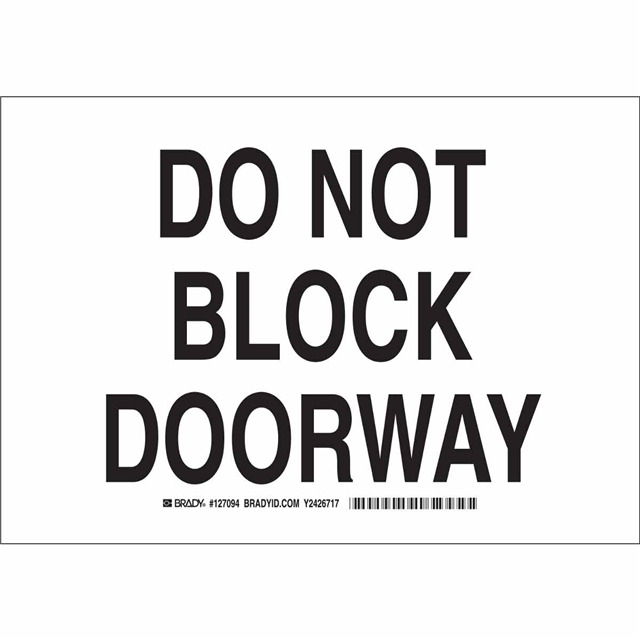 This is manufactured by Brady Corporation. The manufacturer part number is 127096. Label with a size of 14.00" l x 10.00" w (355.6mm x 254.0mm). The product is rohs3 compliant. It is assigned with possible HTSUS value of 3926.90.9989. It has a classic black legend, white background colour. The product brady®, is a highly preferred choice for users. The product is made from highly stable and reliable polyester. In addition, it is reach unaffected. Its typical moisture sensitivity level is not applicable. In addition, bulk is the available packaging type of the product. A bespoke label is a do not block doorway label. The product is suitable for use with warning. It has a long 4 weeks standard lead time. The brady corporation's product offers user-desired applications. The product is designated with the ear99 code number.