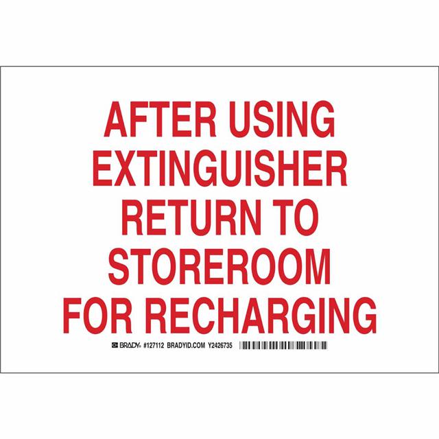This is manufactured by Brady Corporation. The manufacturer part number is 127112. Label with a size of 10.00" l x 7.00" w (254.0mm x 177.8mm). The product is rohs3 compliant. It is assigned with possible HTSUS value of 3926.90.9985. It is shipped in bulk package . It has a classic red legend, white background colour. The product brady®, is a highly preferred choice for users. The product is made from highly stable and reliable polyester. In addition, it is reach unaffected. Its typical moisture sensitivity level is not applicable. A bespoke label is a after using extinguisher return to storeroom for recharging label. The product is suitable for use with notice. It has a long 4 weeks standard lead time. The product is designated with the ear99 code number.