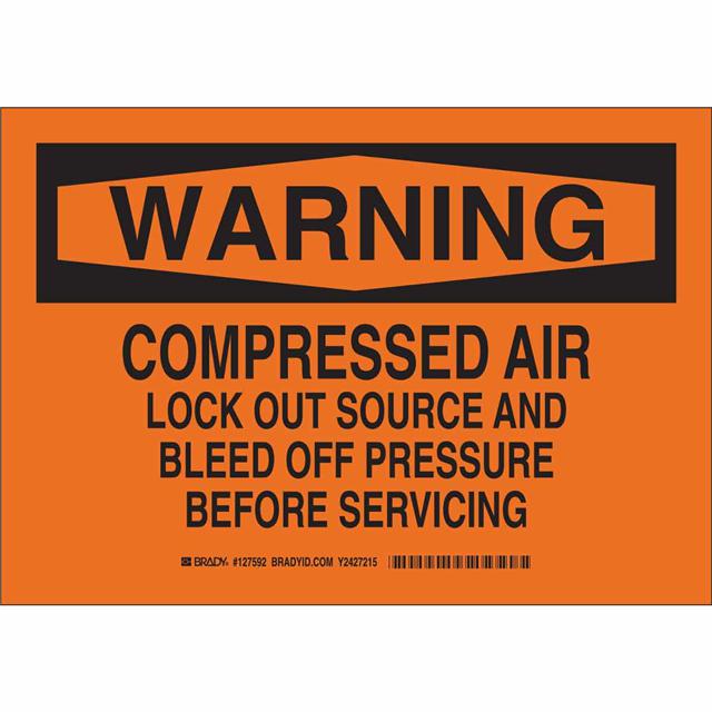 This is manufactured by Brady Corporation. The manufacturer part number is 127592. Label with a size of 10.00" l x 7.00" w (254.0mm x 177.8mm). The product is rohs3 compliant. It is assigned with possible HTSUS value of 3926.90.9985. It is shipped in bulk package . It has a classic black legend, orange background colour. The product brady®, is a highly preferred choice for users. The product is made from highly stable and reliable polyester. In addition, it is reach unaffected. Its typical moisture sensitivity level is not applicable. A bespoke label is a warning. compressed air lock out source and bleed off pressure before servicing label. The product is suitable for use with lock out. It has a long 4 weeks standard lead time. The product is designated with the ear99 code number.