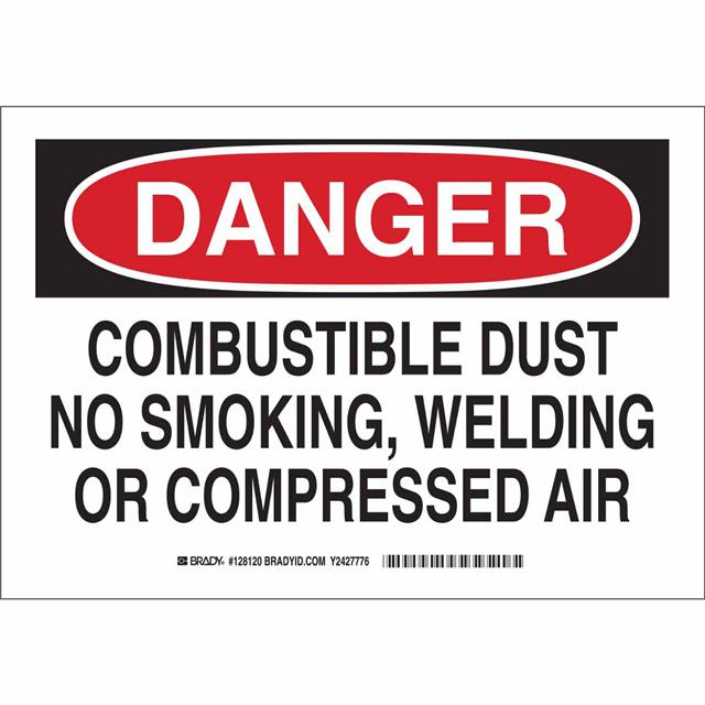 This is manufactured by Brady Corporation. The manufacturer part number is 128120. Label with a size of 10.00" l x 7.00" w (254.0mm x 177.8mm). The product is rohs3 compliant. It is assigned with possible HTSUS value of 3926.90.9985. It is shipped in bulk package . It has a classic black and red legend, white background colour. The product brady®, is a highly preferred choice for users. The product is made from highly stable and reliable polyester. In addition, it is reach unaffected. Its typical moisture sensitivity level is not applicable. A bespoke label is a danger. combustible dust no smoking, welding or compressed air label. The product is suitable for use with warning. It has a long 4 weeks standard lead time. The product is designated with the ear99 code number.