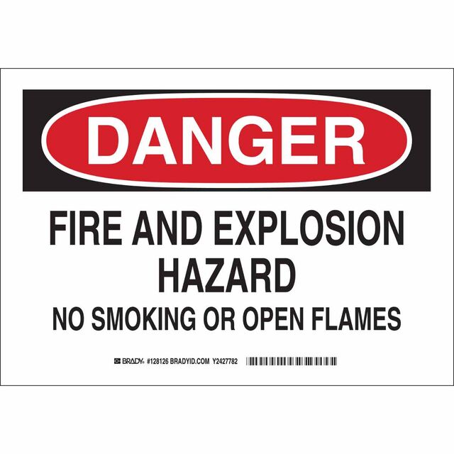 This is manufactured by Brady Corporation. The manufacturer part number is 128124. Label with a size of 10.00" l x 7.00" w (254.0mm x 177.8mm). The product is rohs3 compliant. It is assigned with possible HTSUS value of 8310.00.0000. It has a classic black and red legend, white background colour. The product brady®, is a highly preferred choice for users. The product is made from highly stable and reliable aluminum. In addition, it is reach unaffected. Its typical moisture sensitivity level is not applicable. In addition, bulk is the available packaging type of the product. A bespoke label is a danger. fire and explosion hazard no smoking or open flames label. The product is suitable for use with fire. It has a long 4 weeks standard lead time. The brady corporation's product offers user-desired applications. The product is designated with the ear99 code number.