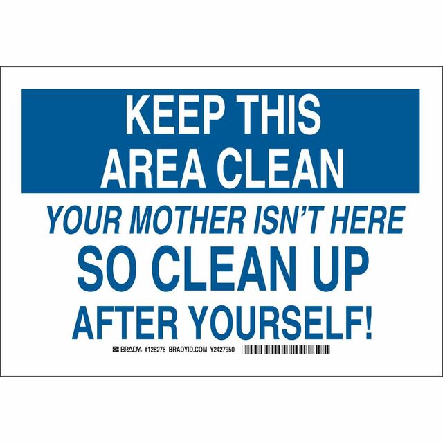 This is manufactured by Brady Corporation. The manufacturer part number is 128274. Label with a size of 10.00" l x 7.00" w (254.0mm x 177.8mm). The product is rohs3 compliant. It is assigned with possible HTSUS value of 8310.00.0000. It has a classic blue legend, white background colour. The product brady®, is a highly preferred choice for users. The product is made from highly stable and reliable aluminum. In addition, it is reach unaffected. Its typical moisture sensitivity level is not applicable. In addition, bulk is the available packaging type of the product. A bespoke label is a keepthisareaclean. your mother isn't here so clean up after yourself! label. The product is suitable for use with warning. It has a long 4 weeks standard lead time. The brady corporation's product offers user-desired applications. The product is designated with the ear99 code number.