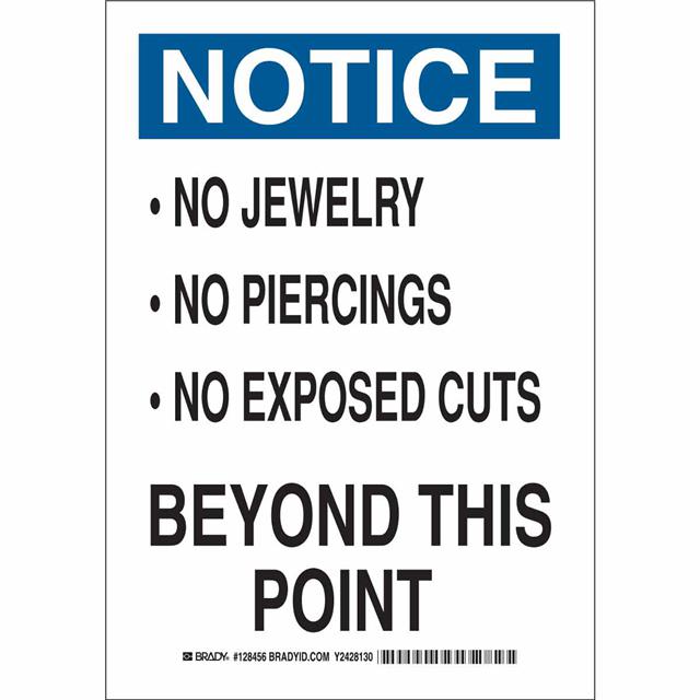 This is manufactured by Brady Corporation. The manufacturer part number is 128454. Label with a size of 10.00" l x 7.00" w (254.0mm x 177.8mm). The product is rohs3 compliant. It is assigned with possible HTSUS value of 8310.00.0000. It is shipped in bulk package . It has a classic black and blue legend, white background colour. The product brady®, is a highly preferred choice for users. The product is made from highly stable and reliable aluminum. In addition, it is reach unaffected. Its typical moisture sensitivity level is not applicable. A bespoke label is a notice. no jewelry no piercings no exposed cuts beyond this point label. The product is suitable for use with notice. It has a long 4 weeks standard lead time. The product is designated with the ear99 code number.