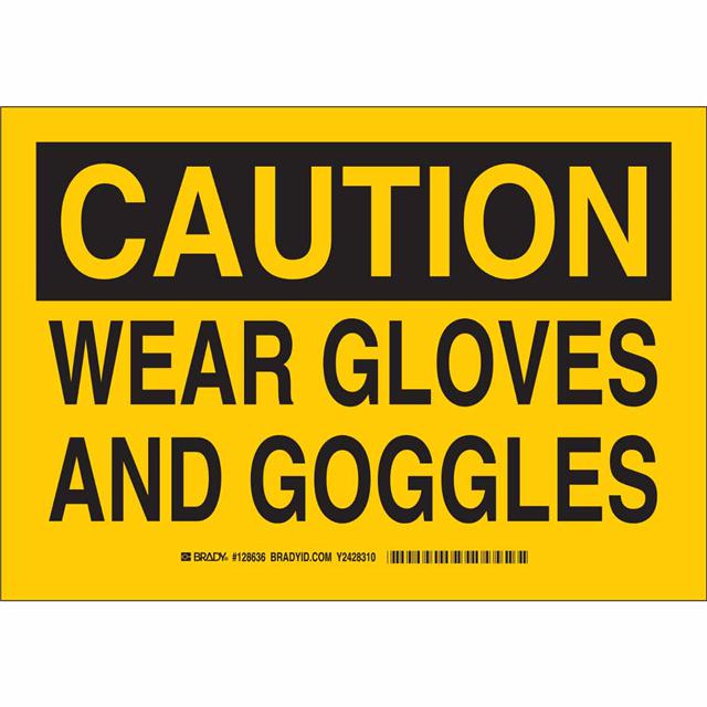 This is manufactured by Brady Corporation. The manufacturer part number is 128636. Label with a size of 10.00" l x 7.00" w (254.0mm x 177.8mm). The product is rohs3 compliant. It is assigned with possible HTSUS value of 3926.90.9985. It is shipped in bulk package . It has a classic black legend, yellow background colour. The product brady®, is a highly preferred choice for users. The product is made from highly stable and reliable polyester. In addition, it is reach unaffected. Its typical moisture sensitivity level is not applicable. A bespoke label is a caution. wear gloves and goggles label. The product is suitable for use with caution. It has a long 4 weeks standard lead time. The product is designated with the ear99 code number.