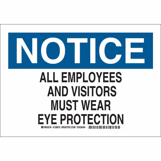 This is manufactured by Brady Corporation. The manufacturer part number is 128812. Label with a size of 14.00" l x 10.00" w (355.6mm x 254.0mm). The product is rohs3 compliant. It is assigned with possible HTSUS value of 3926.90.9989. It has a classic black and blue legend, white background colour. The product brady®, is a highly preferred choice for users. The product is made from highly stable and reliable polyester. In addition, it is reach unaffected. Its typical moisture sensitivity level is not applicable. In addition, bulk is the available packaging type of the product. A bespoke label is a notice. all employees and visitors must wear eye protection label. The product is suitable for use with notice. The brady corporation's product offers user-desired applications. The product is designated with the ear99 code number.